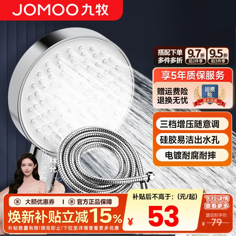 九牧(JOMOO)花洒喷头全套家用增压洗澡淋浴莲蓬头热水器手持淋雨花洒软管套装 增压喷头S260033+软管(1.5米)