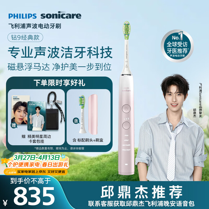 飞利浦(PHILIPS)邱鼎杰推荐款声波电动牙刷高端钻石9系生日礼物 情侣款送男生女友去除99.9%牙渍HX9911/68粉
