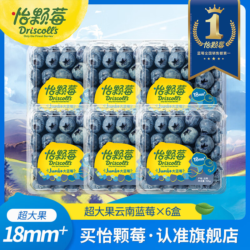 怡颗莓【颗颗饱满】当季云南蓝莓 国产蓝莓 新鲜水果送礼 Jumbo超大125g*6盒(18mm+)