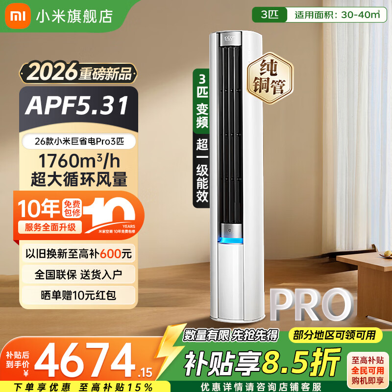 小米(MI)空调3匹 巨省电Pro 大风口柜机 新一级能效 变频冷暖 智能自清洁客厅柜机圆柱式立式空调 十年质保 巨省电Pro 26款 大3匹 | APF 5.31 | 节能省电