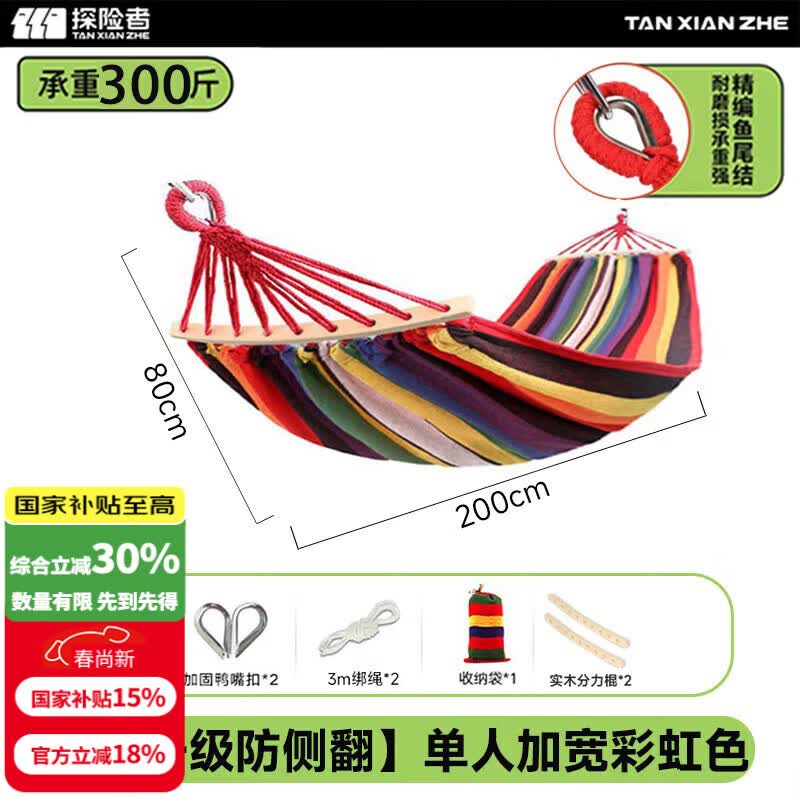 探险者(TAN XIAN ZHE)吊床户外秋千室内单人吊床双人吊床加宽加厚帆布秋千宿舍吊床 【升级防侧翻】单人加宽彩虹色