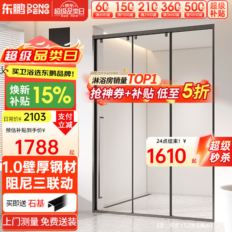 东鹏(DONGPENG)淋浴房三联动推拉门一字形卫生间隔断干湿分离玻璃浴室隔断沐浴房 枪灰0.9-0.99/2米高|极窄 升级1.0壁厚不锈钢+2cm极窄边框