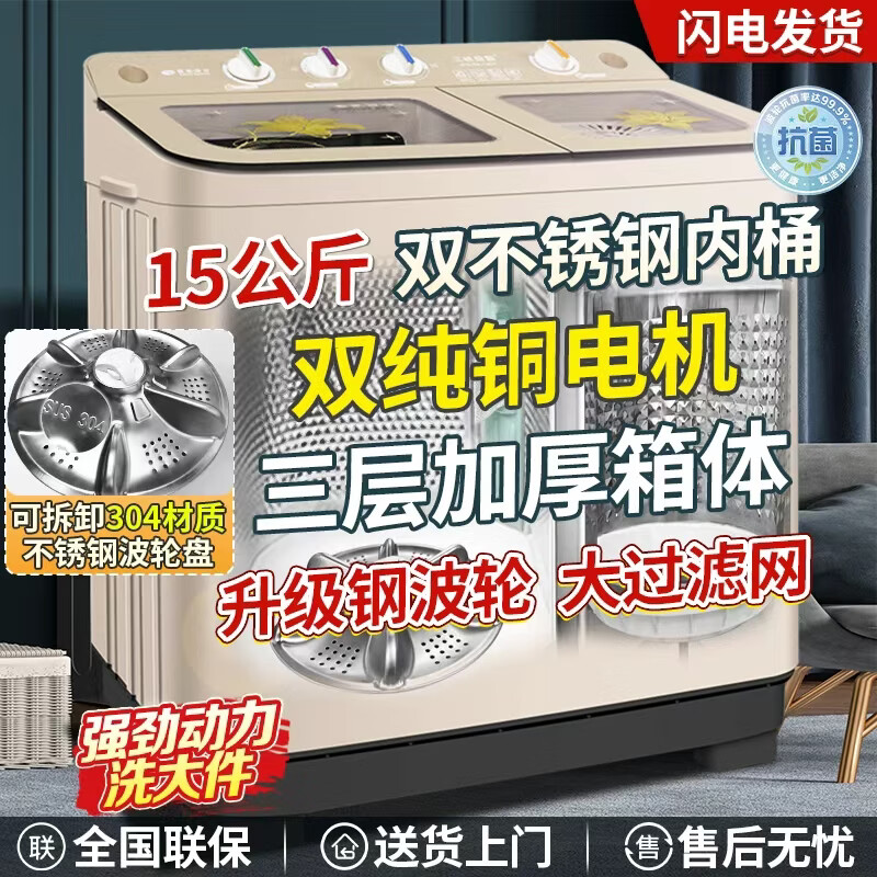 三峡劲霸【纯铜电机】大容量半自动洗衣机家用老式大容量双缸双桶商用酒店宾馆被子毛毯四件套以旧换新 15公斤钢波轮【9秒强洗+双钢桶+纯铜电机】 双缸