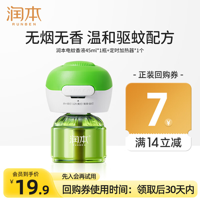 润本蚊香液电蚊香液驱蚊液定时加热器驱蚊防蚊蚊香无香型驱蚊水 【3档定时-试用优选】无味1液+1器