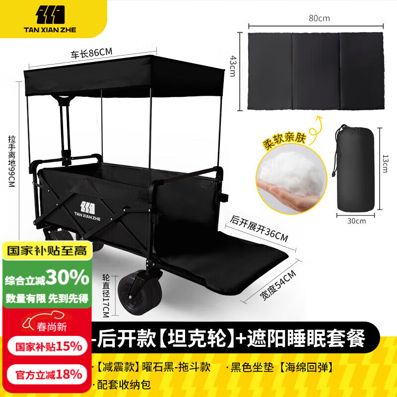 探险者露营车折叠推车户外露营儿童小推车营地车拉年货小拖车聚拢型推车 曜石黑-后开坦克轮+遮阳睡眠套餐