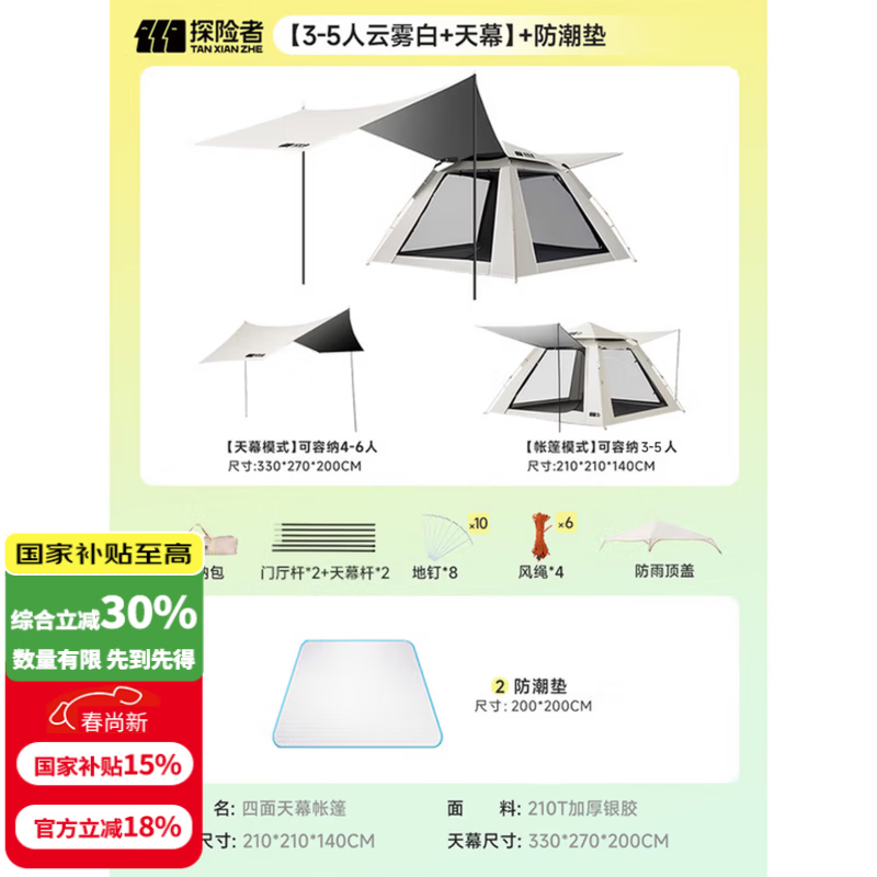 探险者(TAN XIAN ZHE)帐篷户外露营防雨过夜3人-4人速开便捷天幕二合一黑胶防晒帐篷 【3-5人云雾白+天幕】+防潮垫