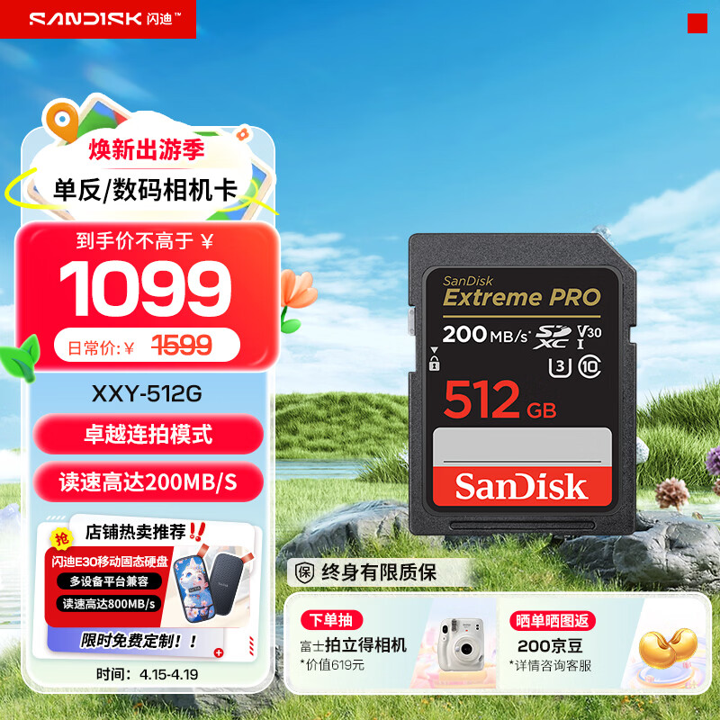 闪迪相机卡 4K高清SD卡 UHS-I微单存储卡微单反摄像储存大卡内存sd卡内存卡 512G 相机SD卡读书高达200Mb/S