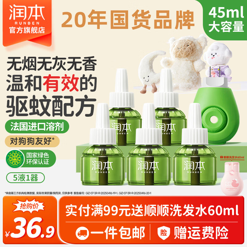 润本蚊香液电蚊香液驱蚊液定时加热器驱蚊防蚊蚊香无香型驱蚊水 【普通款无定时1居室】无味5液+1器