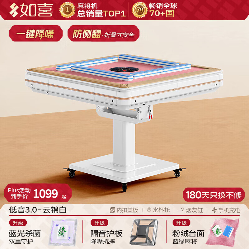 如喜【防侧翻20万次不卡牌】麻将机全自动餐桌低音家两用一体折叠电动 4【低音3.0一键降噪】防侧翻-蓝绿牌-粉绒-云锦白 请联系客服选择麻将牌大小