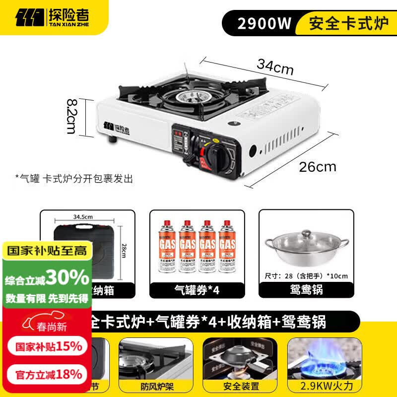 探险者(TAN XIAN ZHE)户外卡式炉露营炉具便携式野外煮火锅炉子卡磁炉全套带锅野餐套装 卡式炉+箱+气券(赠品)*4+鸳鸯锅