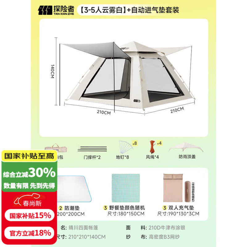 探险者(TAN XIAN ZHE)帐篷户外露营防雨过夜3人-4人速开便捷天幕二合一黑胶防晒帐篷 【3-5人云雾白】+自动进气垫套装