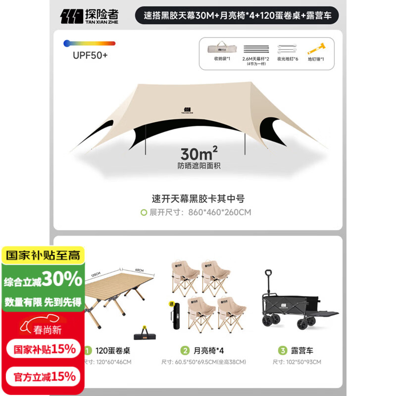 探险者(TAN XIAN ZHE)天幕帐篷户外露营车载便携六角防晒速开懒人天幕野营遮光遮阳棚 【舒适出行】30㎡天幕+月亮椅套装+推车