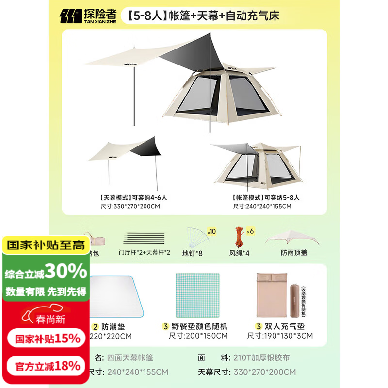 探险者(TAN XIAN ZHE)帐篷户外露营防雨过夜3人-4人速开便捷天幕二合一黑胶防晒帐篷 【5-8人】帐篷+天幕+自动充气床