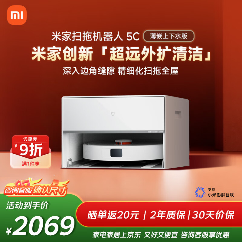 米家【年度爆款新品】扫地机器人5C 薄嵌上下水版扫拖洗一体机防缠绕自动集尘洗拖布机械臂外扩洗地机