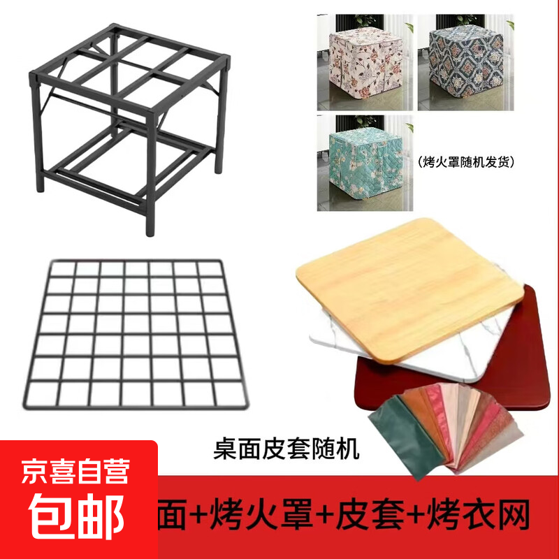 冬季新款烤火桌全套家用餐桌可折叠烤火架不锈钢出租屋宿舍取暖桌 桌架+桌面+烤火罩+皮罩+烤衣网 长86*宽86*高72cm【随机颜色】
