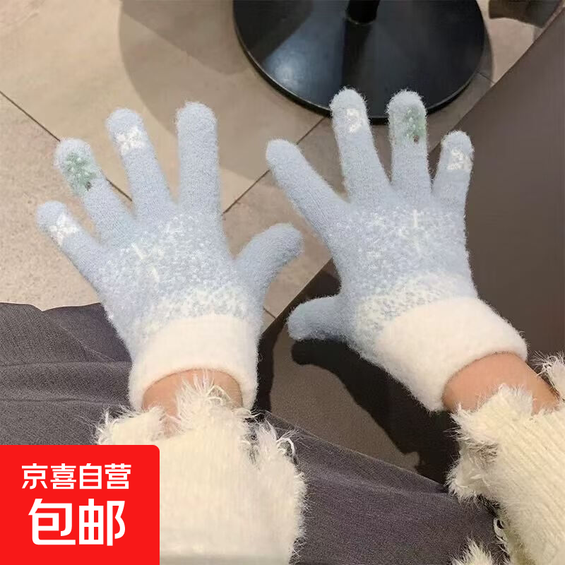 毛茸茸针织手套女生秋冬季韩系可触屏漏二指写字骑行防冻毛绒保暖 圣诞树漏二指浅蓝色
