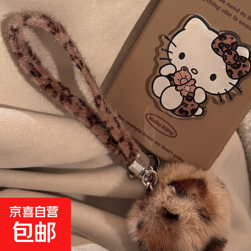 彩色毛绒手绳美拉德色系手机壳挂链适用手机绳便携手腕带绳手提可爱个性防丢手机链手珠 豹绒毛球绳+透明卡片