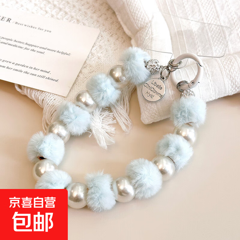 彩色毛绒手绳美拉德色系手机壳挂链适用手机绳便携手腕带绳手提可爱个性防丢手机链手珠 蓝毛球手链+透明卡片