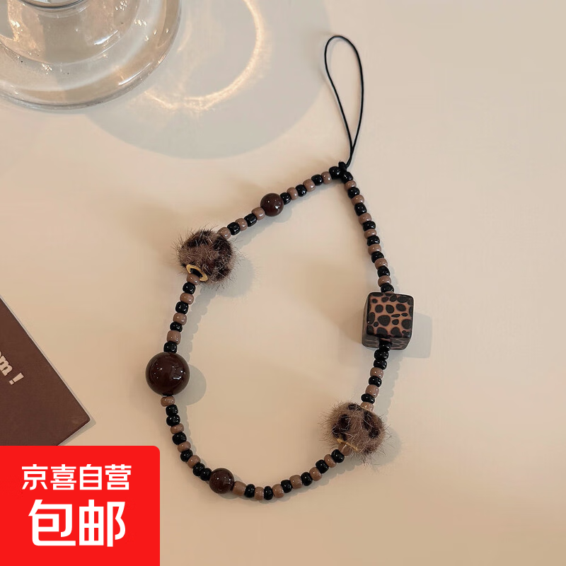 彩色毛绒手绳美拉德色系手机壳挂链适用手机绳便携手腕带绳手提可爱个性防丢手机链手珠 黑棕豹球绳