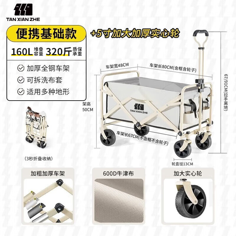 探险者(TAN XIAN ZHE)露营车儿童可躺户外推车野餐车露营装备折叠露营推车营地车买菜车 160L 云峰白【实心万向轮】