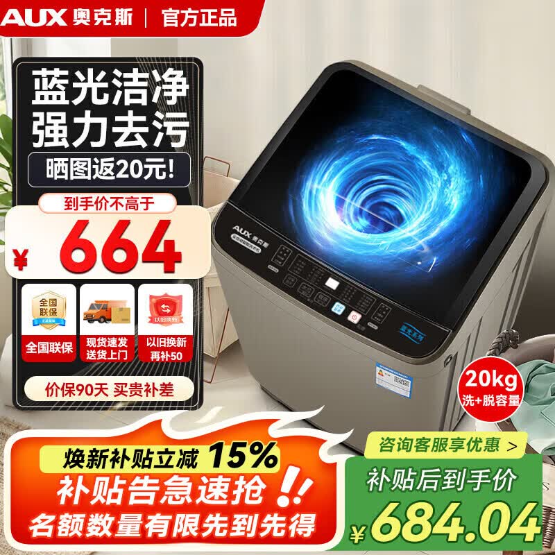 奥克斯全自动洗衣机 家用小型波轮 洗脱一体机大容量 公寓宿舍出租房 【国补】金20KG洗脱容量【蓝光洗护 智能风干】 波轮