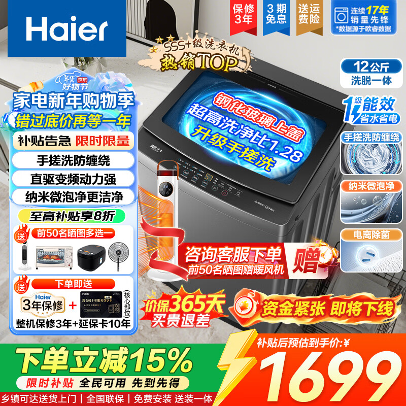 海尔(Haier)12公斤洗衣机全自动大容量家用波轮【落地窗帘可洗】自编程强力洗双侧仿生过滤器以旧换新统帅 升级12KG 直驱+手搓洗防缠绕+1.28洗净比 波轮