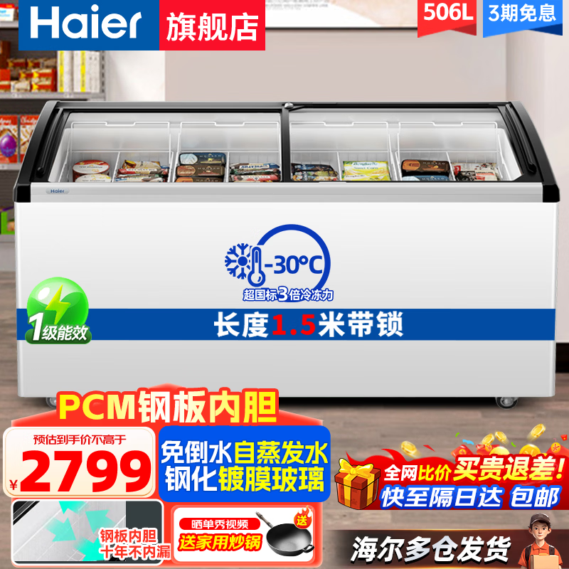 海尔(Haier)商用卧式大容量展示柜冰柜冷冻商超组合岛柜玻璃门雪糕柜弧形门海鲜冻品 1.5米零下30度冷冻506升一级能效带锁