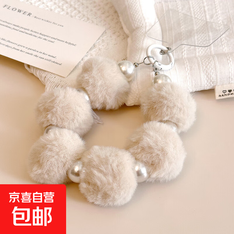 彩色毛绒手绳美拉德色系手机壳挂链适用手机绳便携手腕带绳手提可爱个性防丢手机链手珠 杏毛球手链+透明卡片
