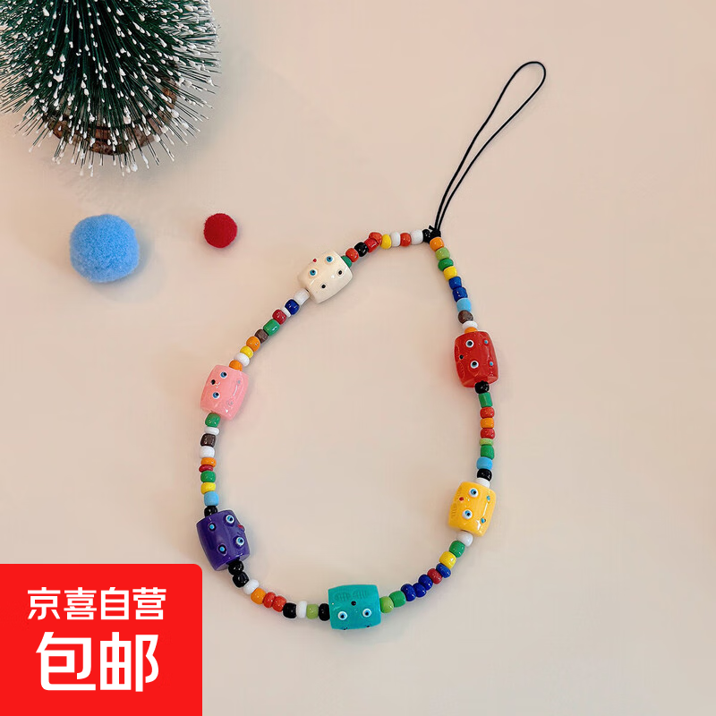 彩色毛绒手绳美拉德色系手机壳挂链适用手机绳便携手腕带绳手提可爱个性防丢手机链手珠 方块彩石绳