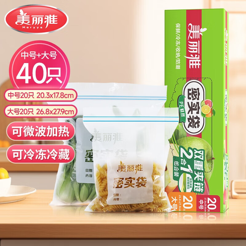 美丽雅(MARYYA)收纳袋 食品级加厚自封袋 家用厨房分装收纳袋防水防潮可微波炉 【中号20只+大号20只】40只装