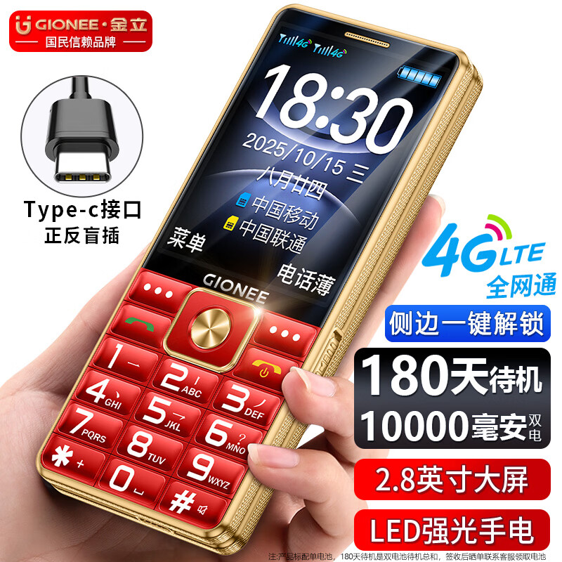 金立(Gionee)老年手机4G全网通5000毫安老年机超长待机2.8大屏大字体大声音老人手机老年人专用按键功能机 红色