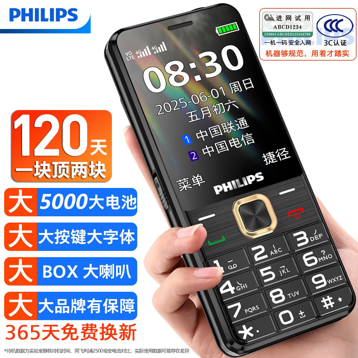 飞利浦(PHILIPS)老年人手机4G全网通全新款120天超长待机大屏大字大声音老年人专用手机学生按键功能机T930 星空黑