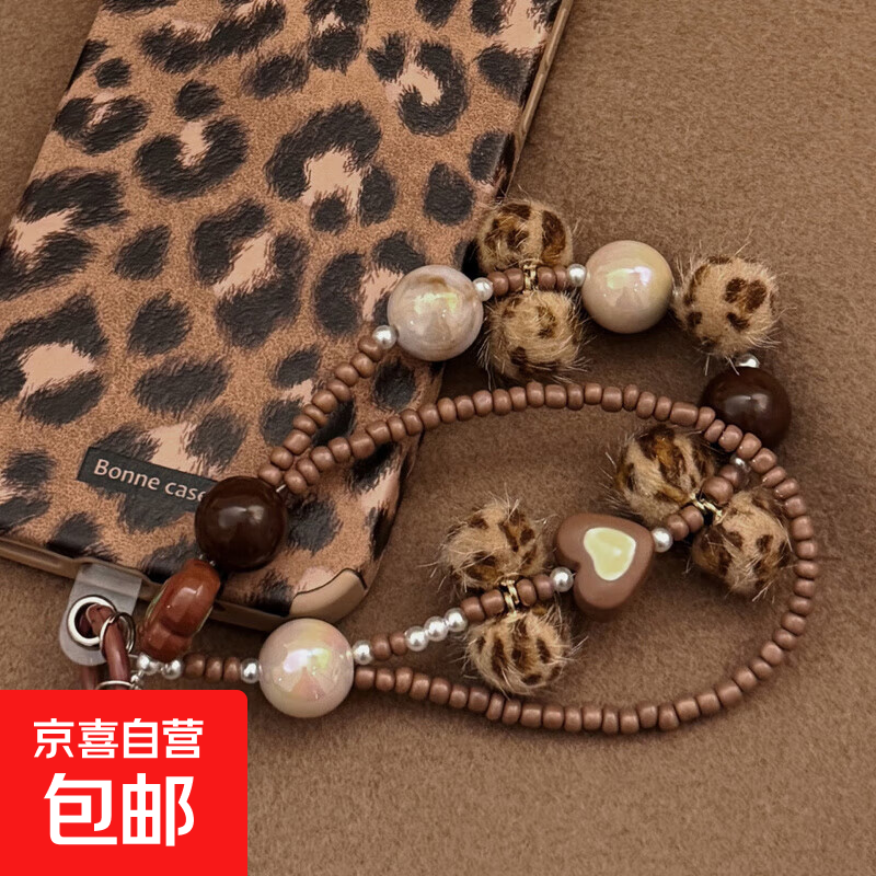 彩色毛绒手绳美拉德色系手机壳挂链适用手机绳便携手腕带绳手提可爱个性防丢手机链手珠 豹纹球珠绳+透明卡片