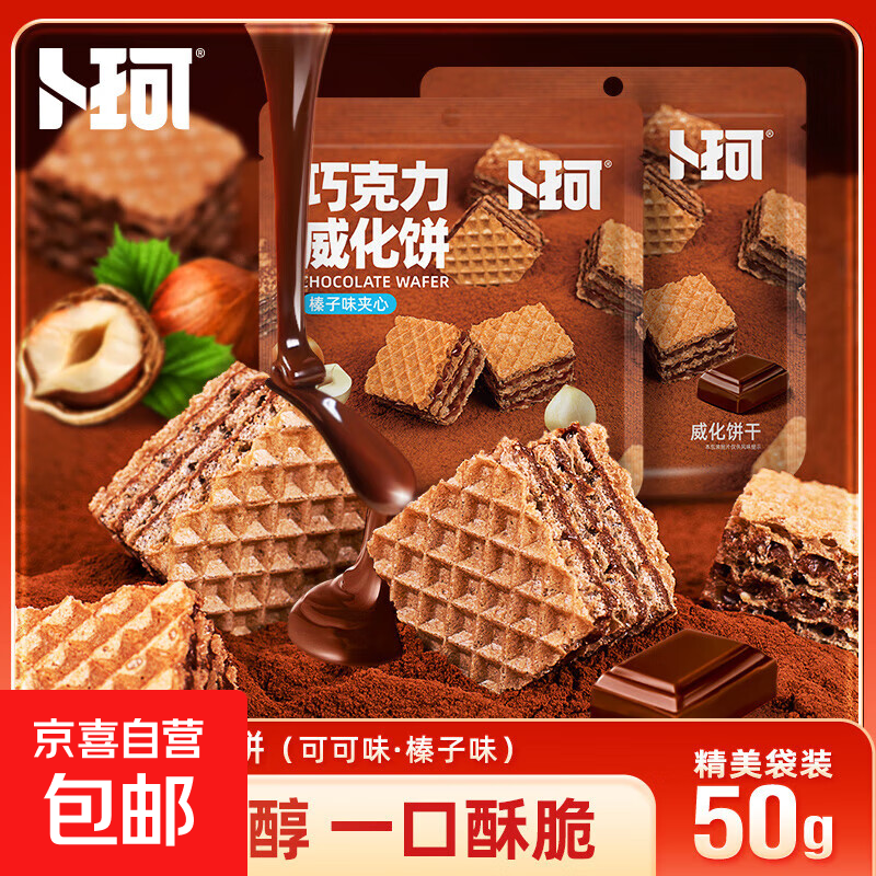 卜珂巧克力夹心威化饼干早餐饼干小点心下午茶巧克力味休闲零食品 巧克力威化饼干榛子味50g*3袋