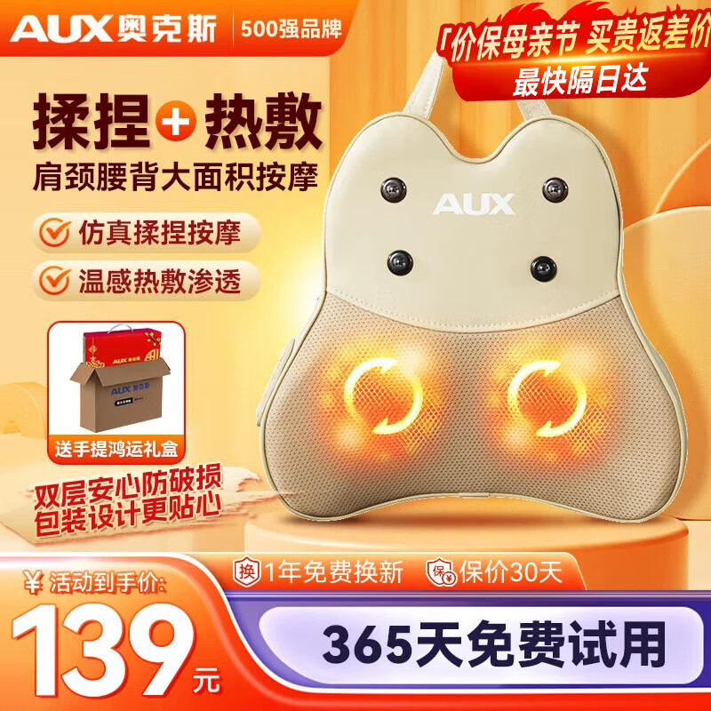 奥克斯(AUX)腰部按摩器腰部按摩仪颈腰椎按摩靠垫热敷腰肌劳损背部按摩枕办公生日父母亲节礼物实用送妈妈爸爸 米色【礼盒装】4磁石+环抱护腰多部位按摩+红光热敷 父亲母亲节礼物高端实用送妈妈老婆爸爸母亲礼品