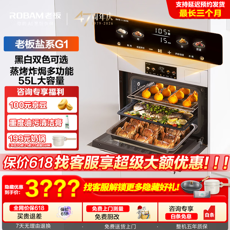 老板(Robam)盐系C90D-G1/C90A-G1蒸烤箱一体机嵌入式55L大容量蒸烤炸焗多功能家用蒸箱烤箱电烤箱搪瓷内胆 【品质款】海盐白G1 55L大容量
