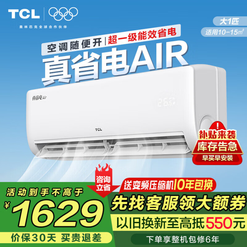 TCL空调挂机 大1.5匹/大1匹新一级能效节能变频家用冷暖 卧室自清洁壁挂式空调JD以旧换新 真省电系列 大1匹 一级能效快速冷暖