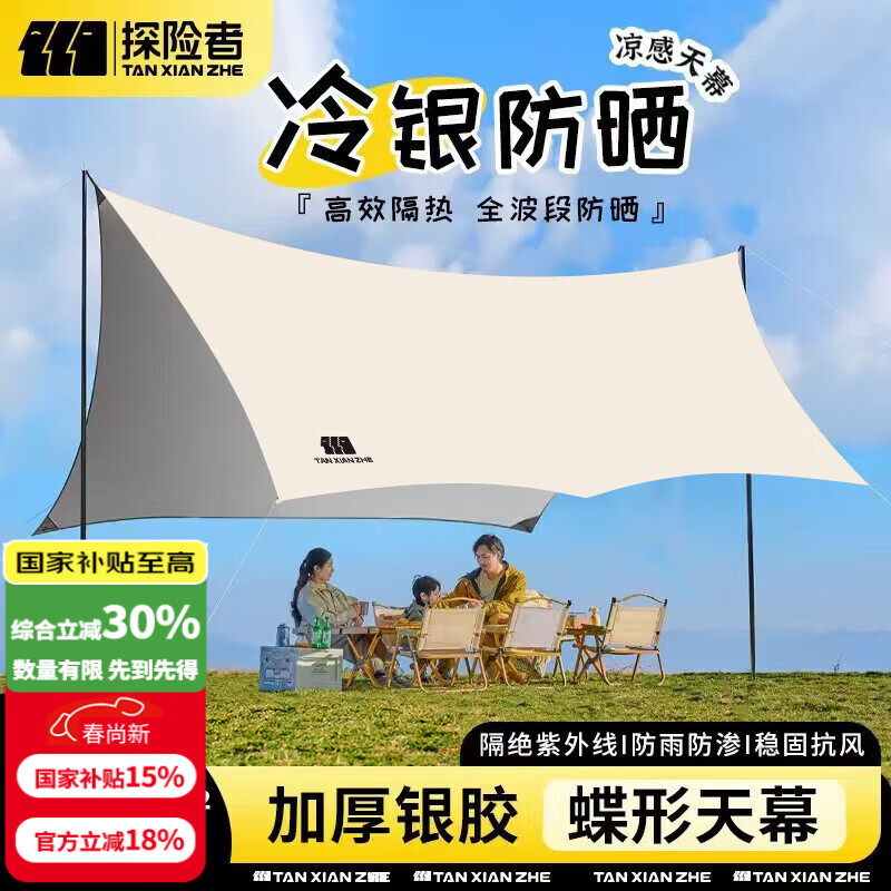 探险者(TAN XIAN ZHE)天幕帐篷露营天幕户外8-10人露营装备全套防晒蝶形防雨防风遮阳棚 10㎡霜奶白银胶天幕【2-8人】