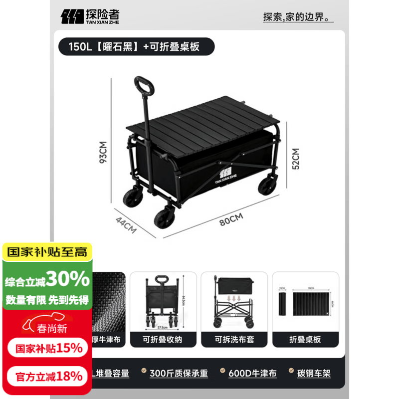 探险者(TAN XIAN ZHE)户外露营小推车折叠露营推车营地拖车野餐桌板手拉车摆摊快递车 150L 【曜石黑】+可折叠桌板