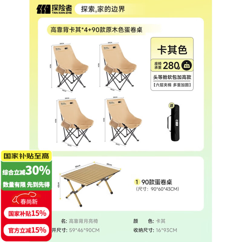 探险者月亮椅户外折叠椅露营椅子高靠背便携高背钓鱼野餐沙滩桌椅全装备 加高靠背卡其*4+90款蛋卷桌