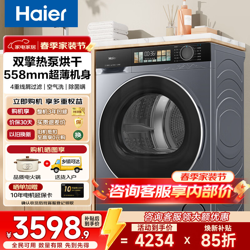 海尔(Haier)云溪37E/77E/579/27E/58E热泵烘干机家用10公斤干衣机空气洗衣物护理机除菌螨4重净虑 以旧换新 云溪4.0丨37E双擎双变频热泵烘干机4层毛屑过滤