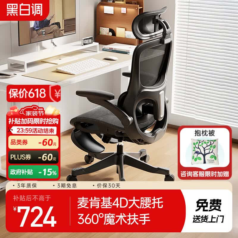 黑白调P2 Pro+二代人体工学电脑椅办公椅学习椅久坐舒适电竞椅4D腰托 P2Pro+二代耀黑脚托 4D腰托+360°扶手