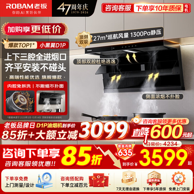 老板(Robam)【咨询客服价更低】小黑翼顶侧双吸油烟机灶具套装超薄平嵌家用大吸力7字型D1P青春版烟灶套装 【金榜推荐】D1P升级款27风量
