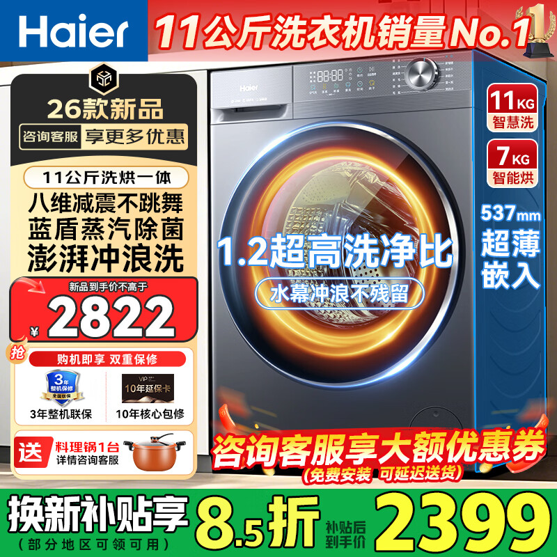 海尔(Haier)滚筒洗衣机26款新品10/11公斤云溪4.0直驱变频洗烘一体机全自动带烘干国家补贴一级能效以旧换新 11kg古典美学【母婴蓝盾除菌+8维减震】 滚筒洗烘 咨询客服更优惠