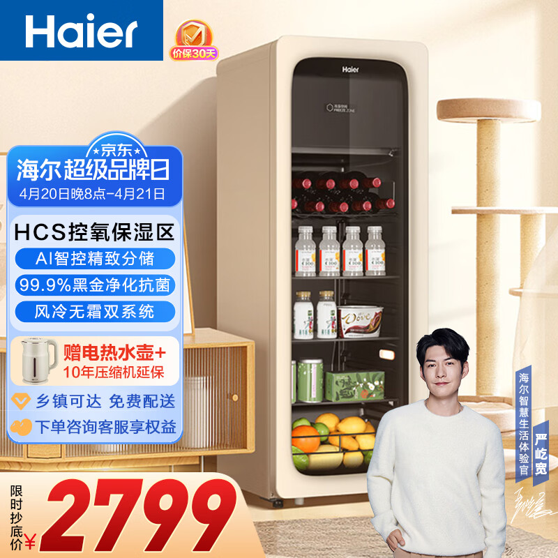海尔(Haier)冰吧家用小型迷你冰箱客厅办公室卧室单门饮料茶叶水果红酒冷藏保鲜展示柜透明玻璃门超薄立式冰柜 双温区元气冰吧丨冷冻室可制冰丨象牙米 133L