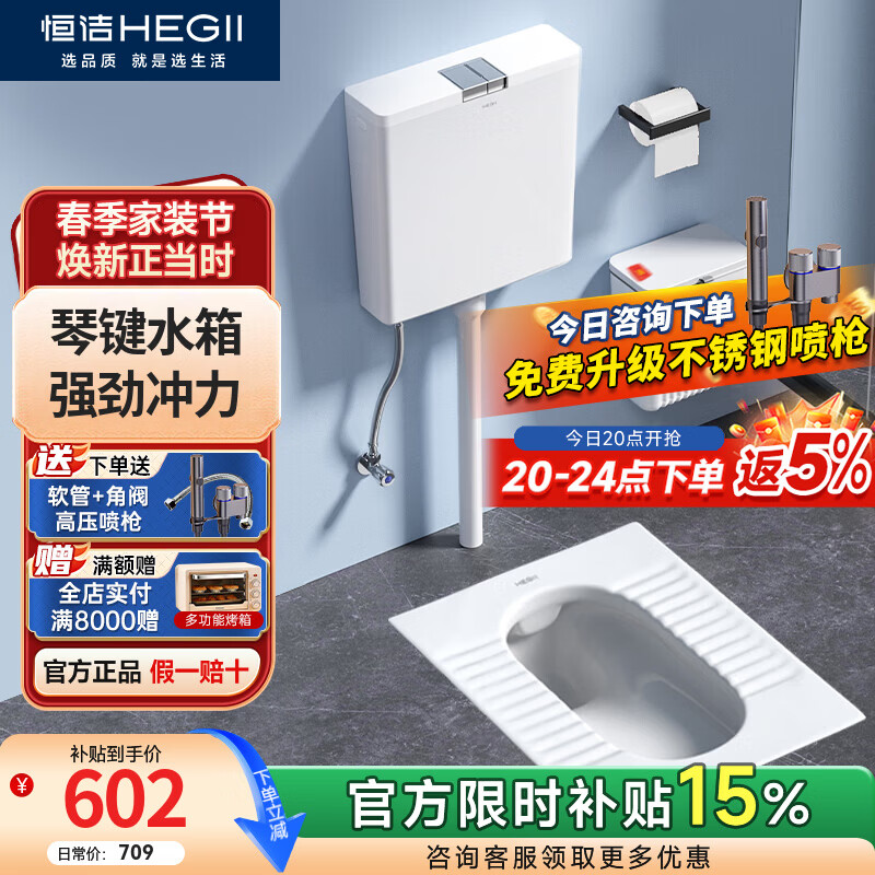 恒洁(HEGII)专利款蹲便器水箱套装超薄防溅防臭卫生间蹲便蹲坑蹲厕大便器3026 3100B02蹲便器+6050琴键大冲力水箱套装