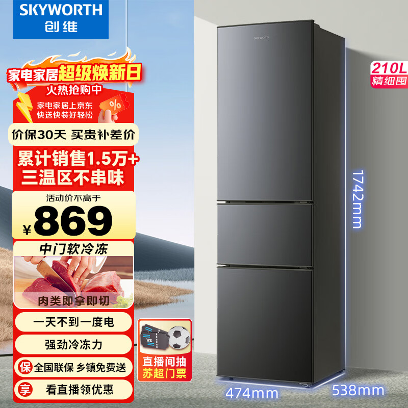 创维 (SKYWORTH)210升小冰箱 三门家用小型电冰箱 三门三温区中门软冷冻 保鲜省电低音P21TJ