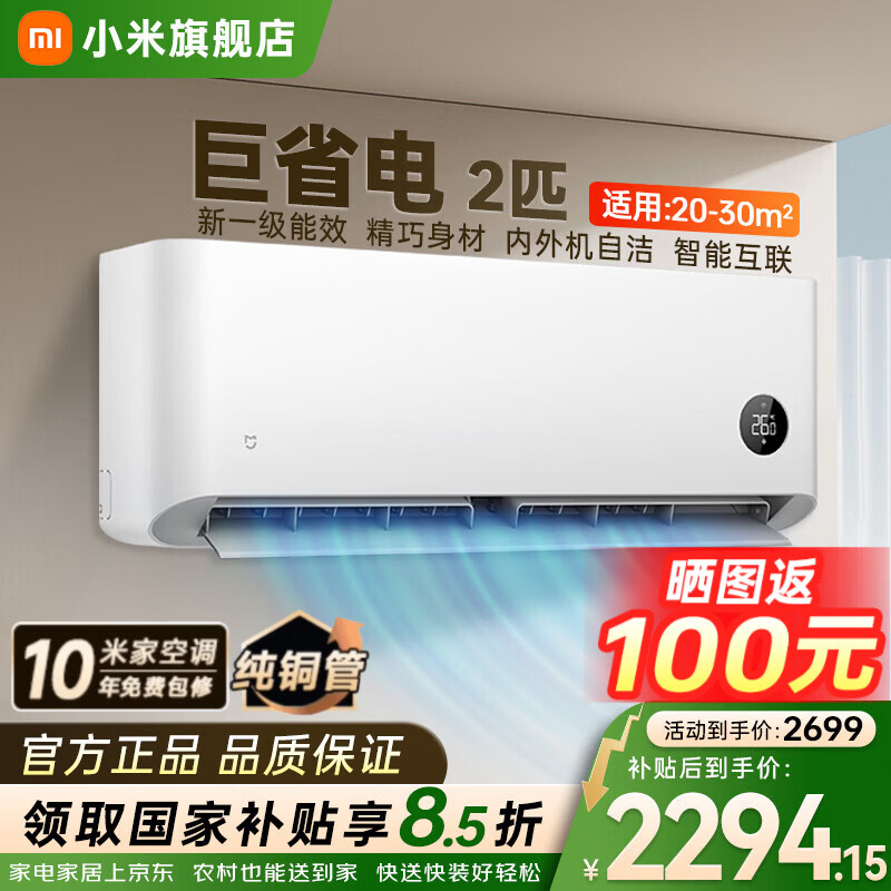 小米(MI)米家新款1.5匹巨省电 双排款 健康风 变频冷暖智能互联自清洁一级能效壁挂式卧室客厅家用空调挂机 2匹 一级能效 巨省电 KFR-50GW/N2A1