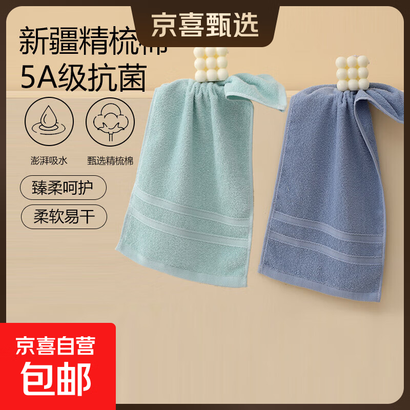 【洁丽雅同款】5A抗菌纯棉毛巾马卡龙色夏季运动毛巾情侣洗脸家用 5A抗菌素色面巾-绿+蓝 2条