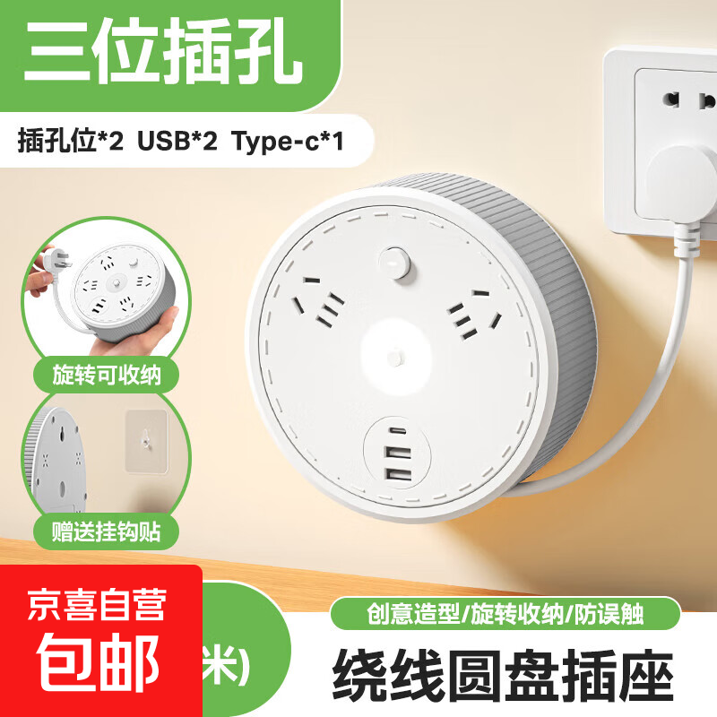 【京东物流】可收纳接线板 USB充电多功能开关面板家用插排 公牛同款 带线插座环形插座 灰色收纳【2插位+USB+夜灯】 全长1.8米